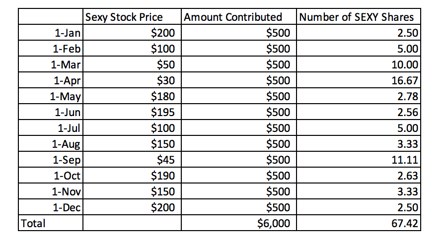 Think about it this way, if Jan 1st, the price of SEXY stock was $200 – you get 30 shares of SEXY if you contributed $6000 that day ($6000/$200). But throughout the year, SEXY fluctuated. Look at table below: